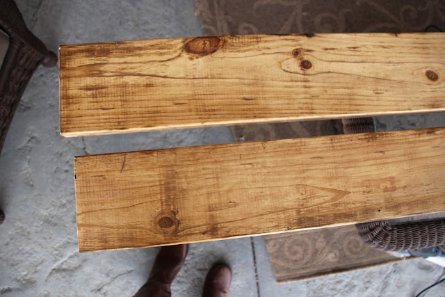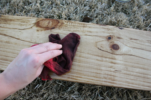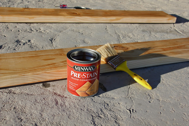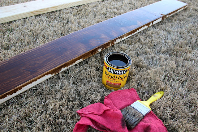 Then I stained my boards with about 3 coats of Minwax Early American. You'll want to do this in the grass or somewhere where you can get a little messsy.