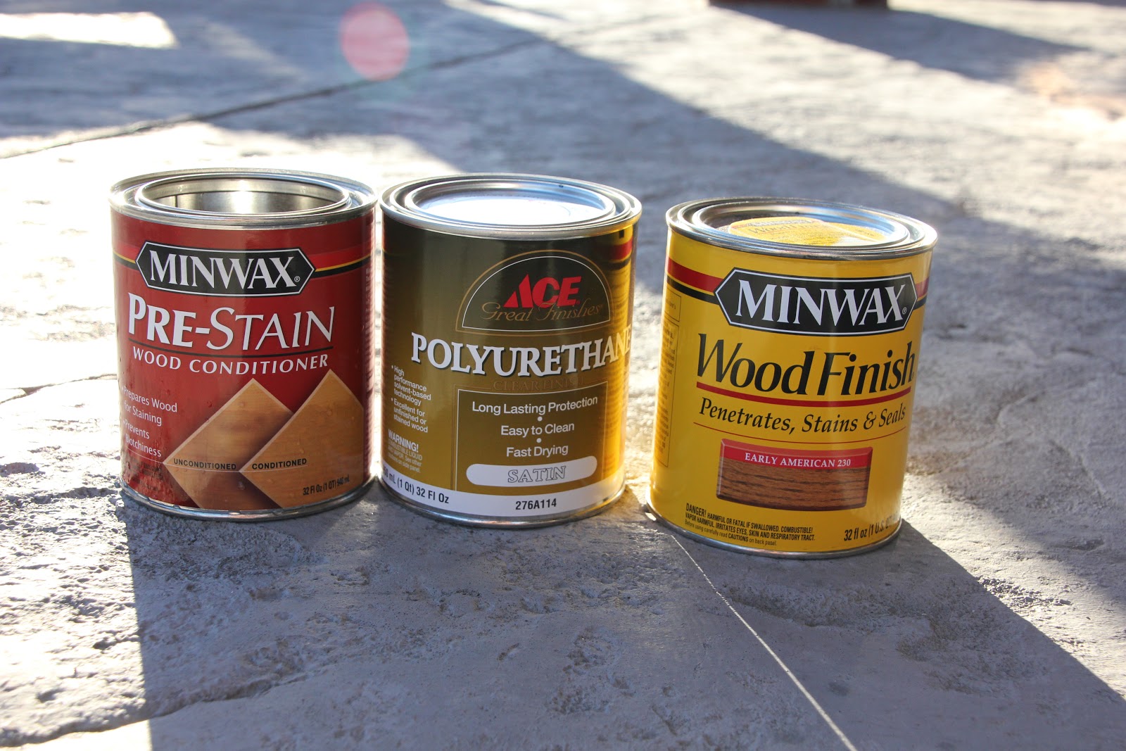 Next, I made a trip to Ace Hardware and purchased the following (I ended up using a different Polyurethane, pictured below). The pre-stain may not be entirely necessary and actually I would not recommend if you're going for a darker, richer color than I achieved. But I do highly recommend Minwax Early American. It highlighted the wood grain without staining too dark everywhere else. `