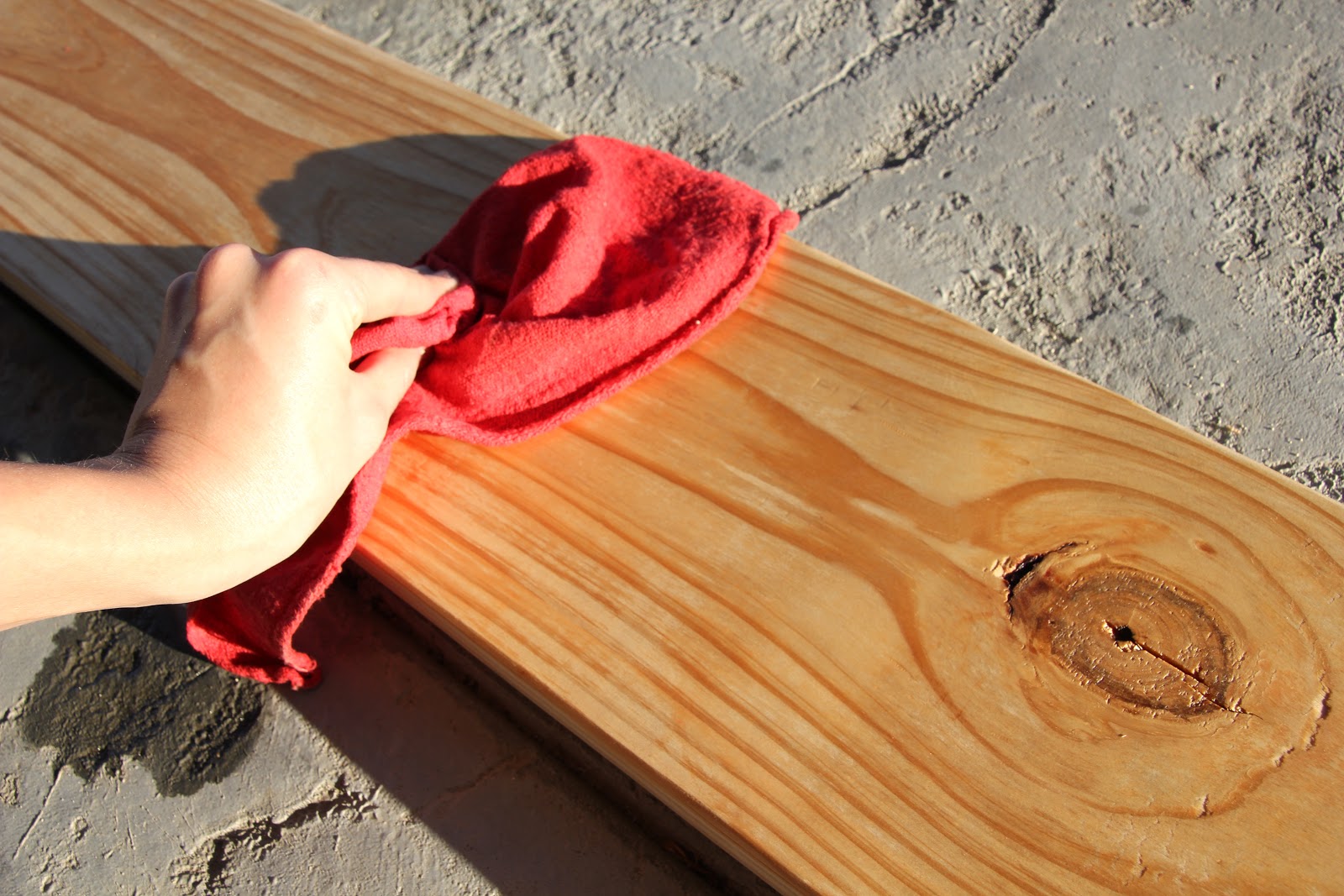 Just like the conditioner, you brush the stain all over and gently wipe it away. You may choose to let the stain sit for a few minutes before wiping. It worked well that I would paint one board, then the other, then wipe the first board clean.