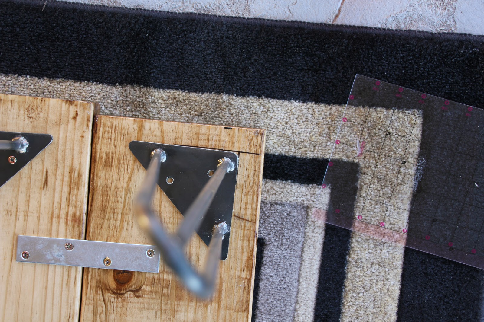 After 24 hours drying time, I laid my boards on a hard surface (using old rugs to protect them). Next I spaced out my brackets about a foot apart from each other. I avoided knots and cracks in the wood, as the boards are more like to split there.
