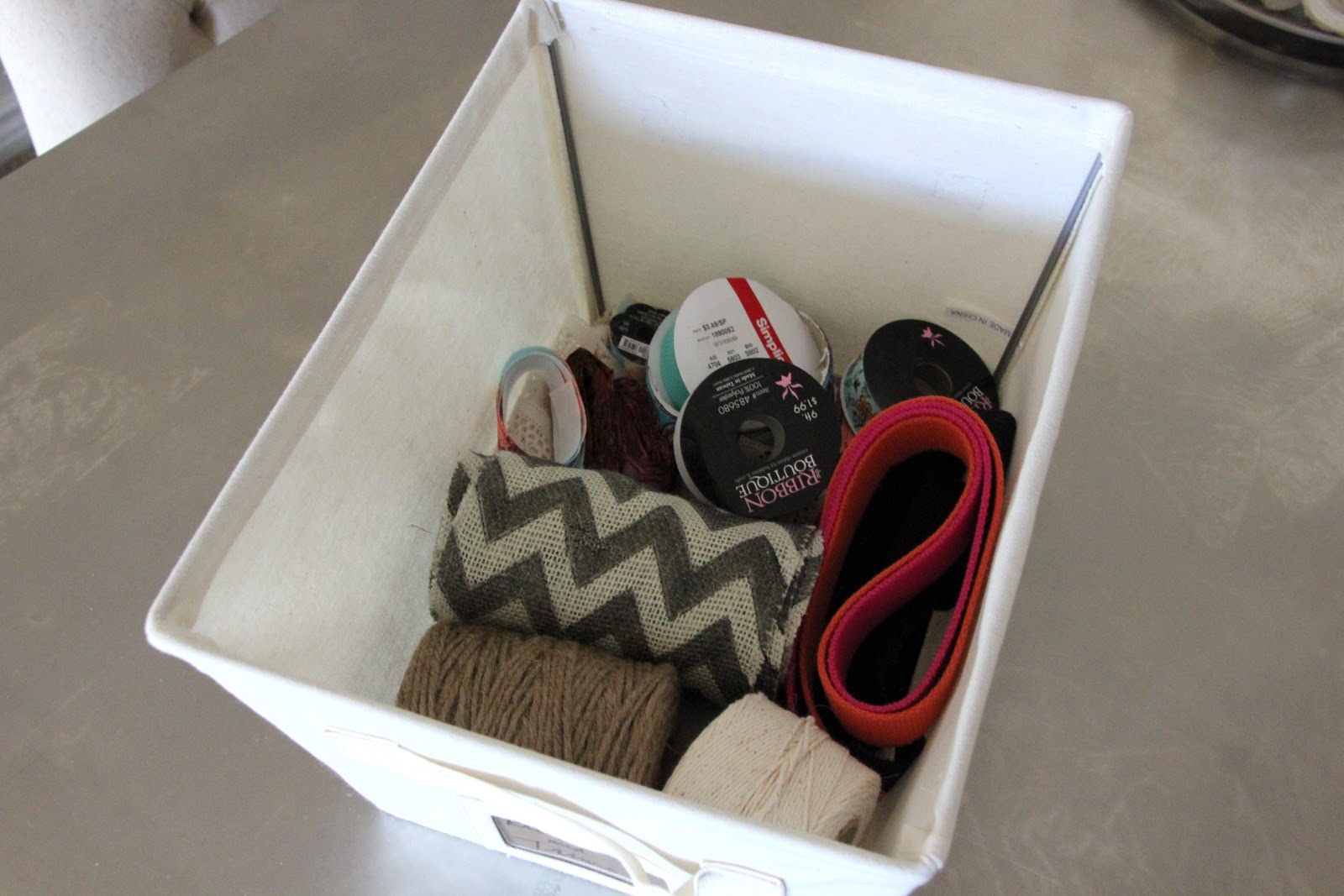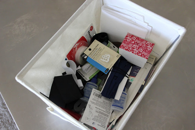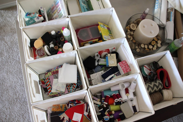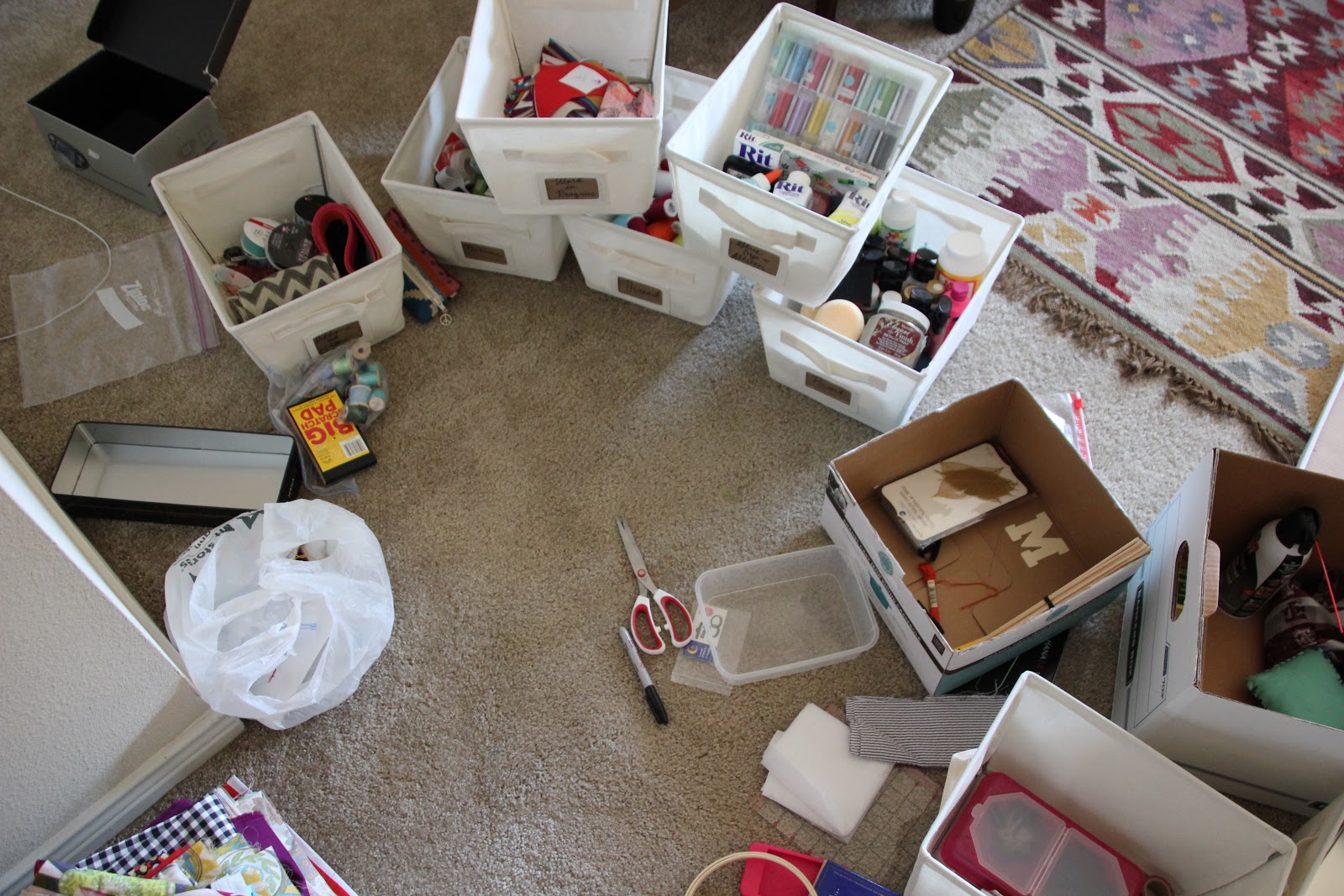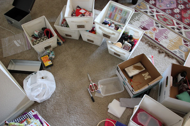 I knew I had enough paint, thread, and fabric to constitute having their own bins. Then I had to start grouping everything else together in a way that made sense to me. I spent a lot of time on the carpet going through each and every thing. I can't believe how much I've accrued over the last few years.