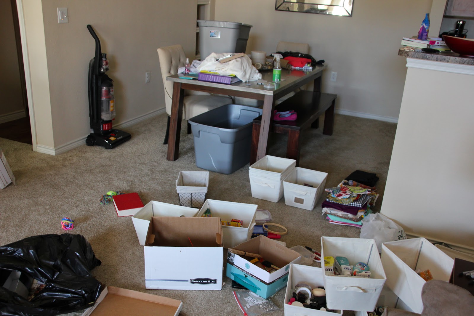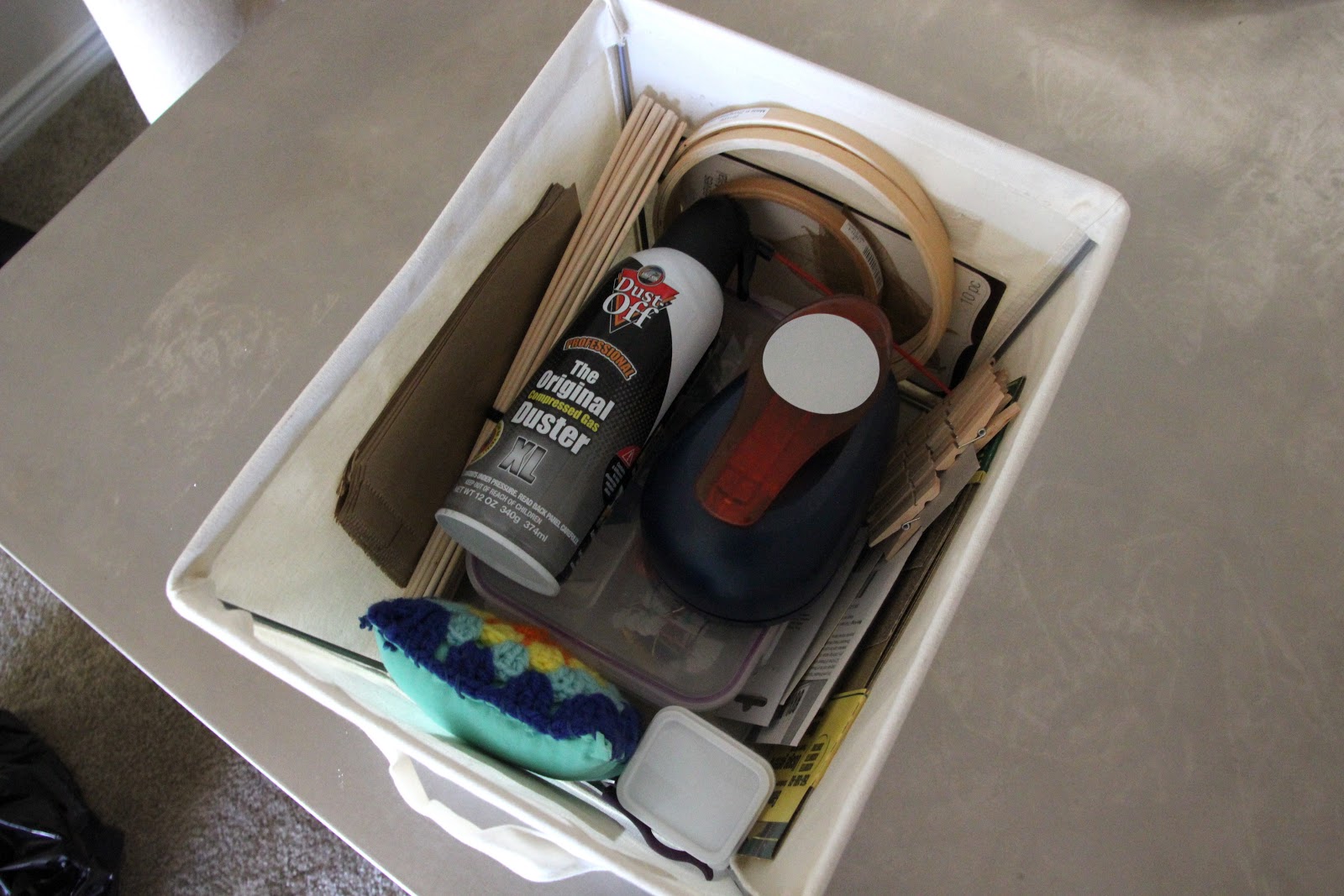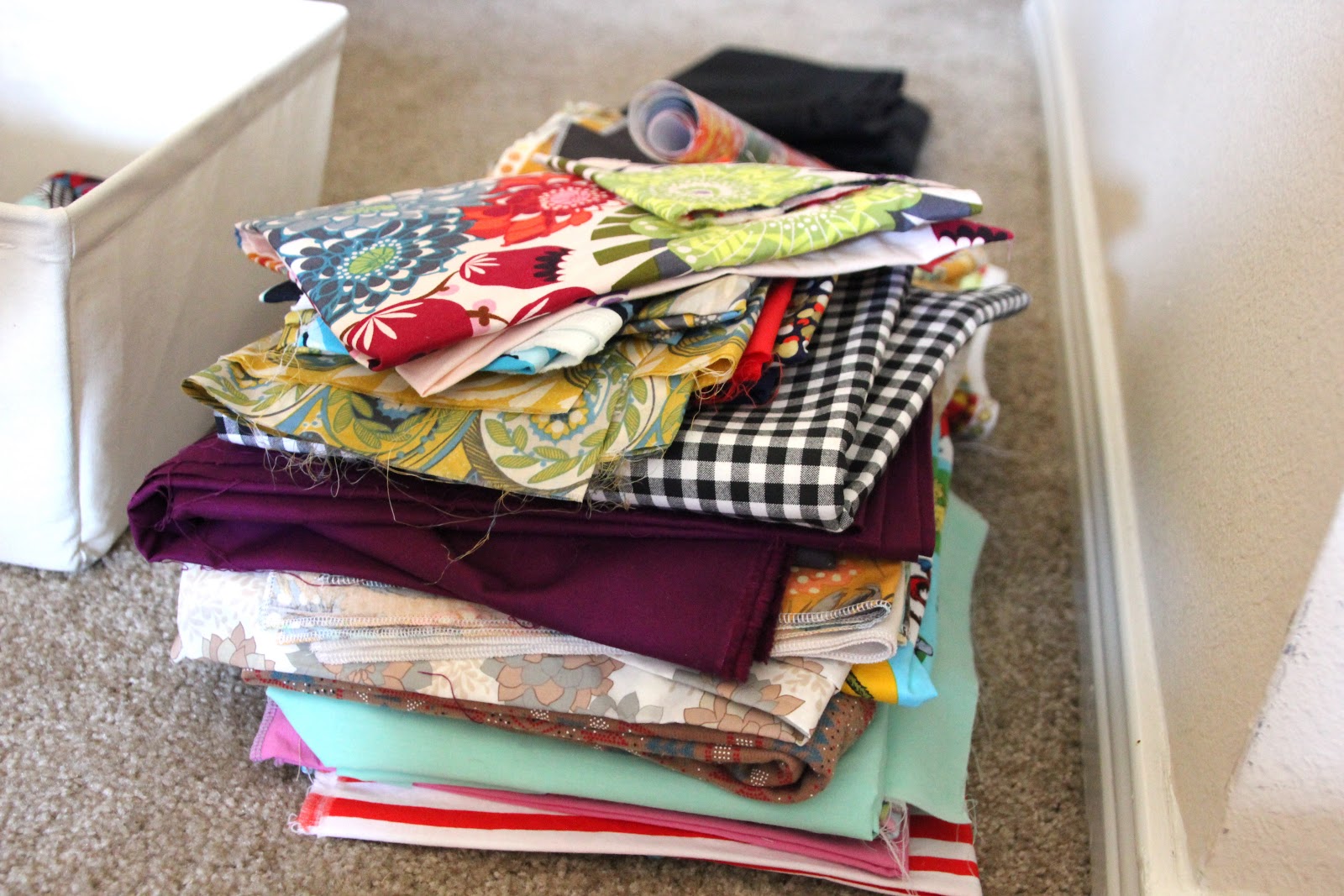 I knew I had enough paint, thread, and fabric to constitute having their own bins. Then I had to start grouping everything else together in a way that made sense to me. I spent a lot of time on the carpet going through each and every thing. I can't believe how much I've accrued over the last few years.