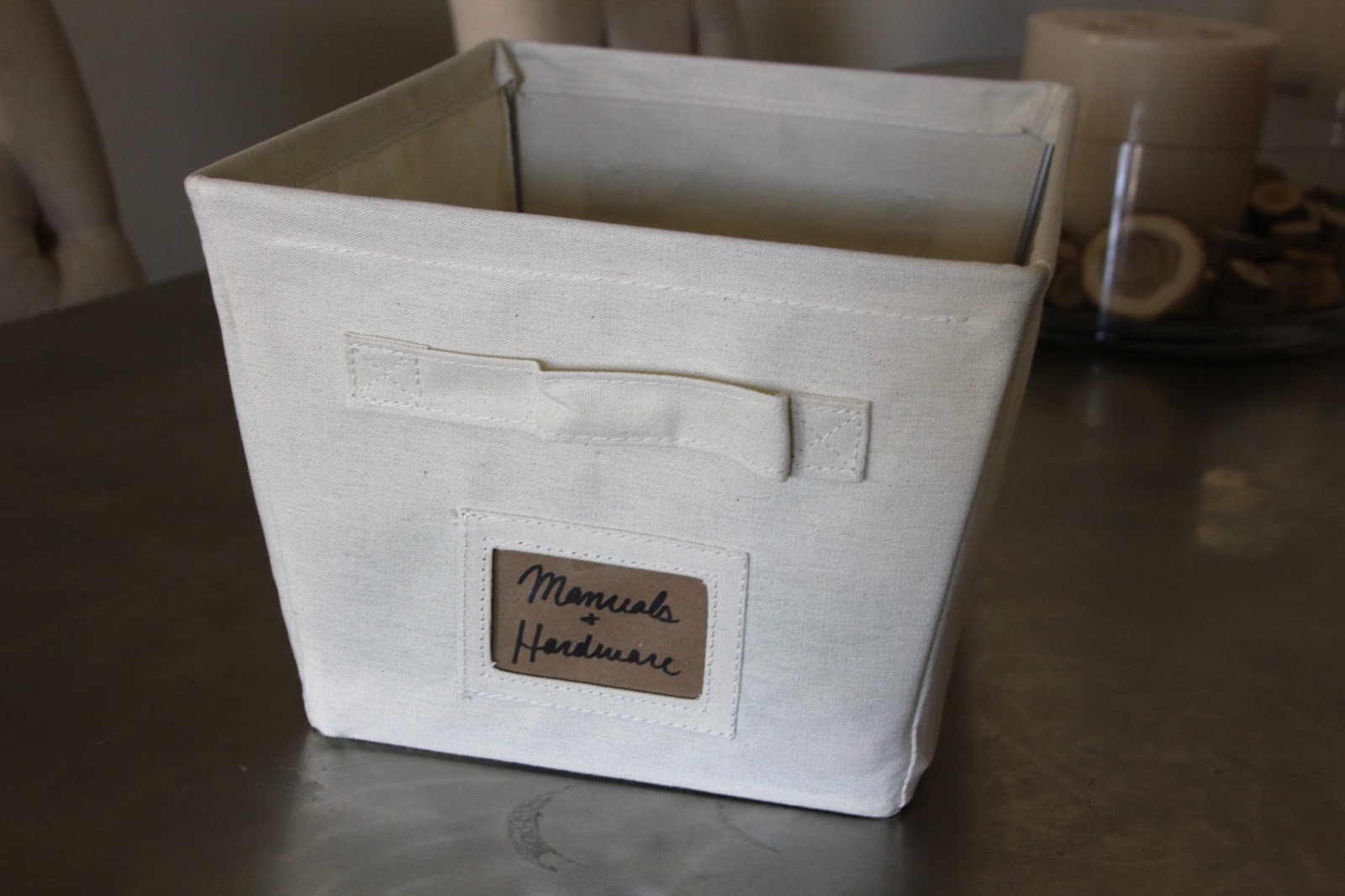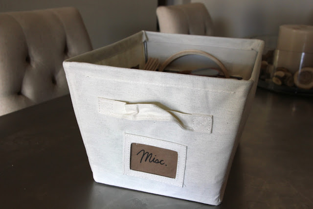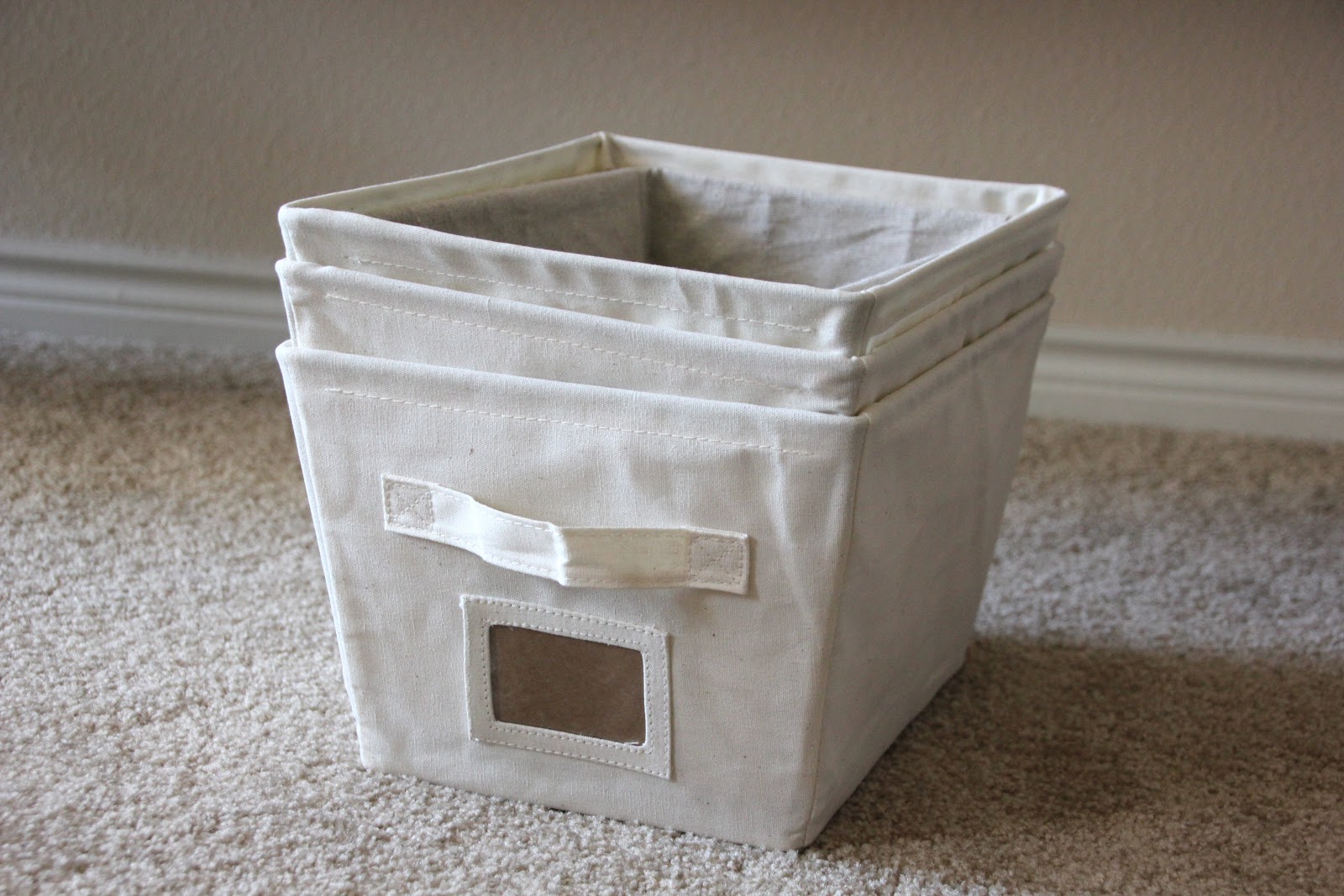 Once I had assembled the shelves and put them in the closet, I spent time making some labels for the linen baskets. They were just $5 each at Walmart. They're nice and durable and I love that they have an easy way to label them.