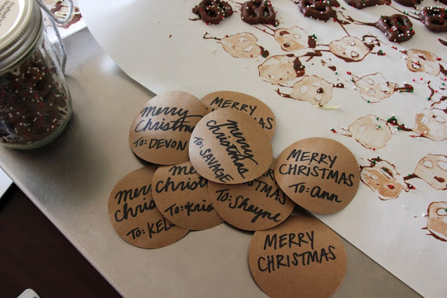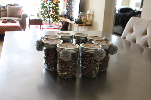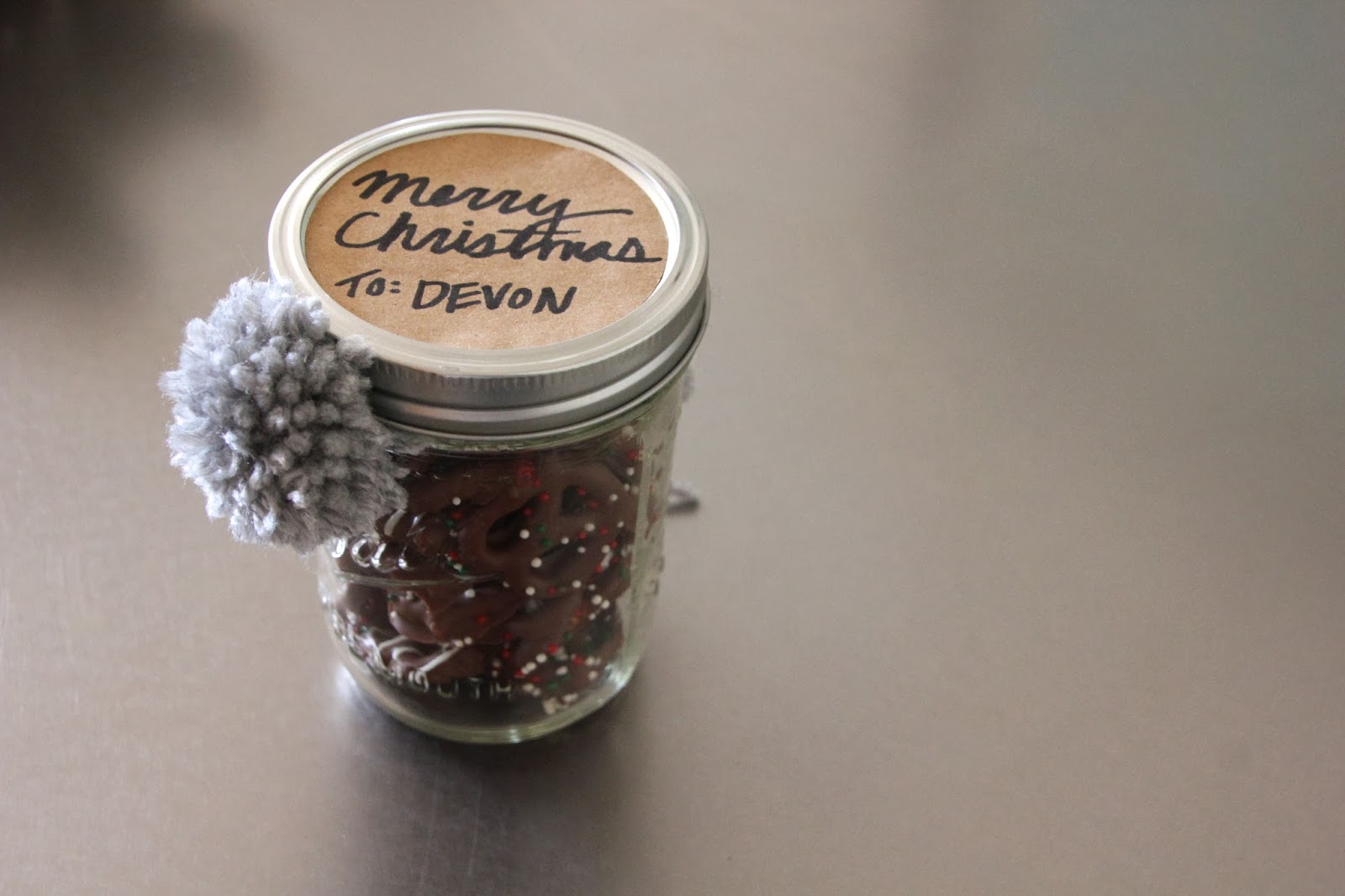 After letting my pretzels spend the night setting, I set up a gift station. My jars were purchased in groups of 4 at Walmart, and I kept the decoration pretty minimalist with a kraft paper label and some yarned turned into "poufs".