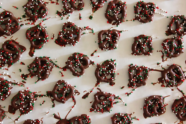 We were hit with an insane ice storm this weekend. I mean parking lots turned into ice skating rinks and every square inch was covered with at least 3 inches of ice. I have never seen anything like it. Being that Texans are completely ill-prepared to handle the ice, my weekend turned into a 5 day hiatus. Basically a stay-in-your-house-because-you-can't-even-get-out-of-your-driveway event. I'll admit I was going a bit stir-crazy. One afternoon, a friend who lives close and I ventured out for a quick trip to Walmart for some much-needed supplies. All was well until we met the highway bridge. Our lives may or may not have flashed before our lives as we creeped along the bridge losing traction every few seconds. Thankfully we made it through and I was able to get the supplies for my 5th consecutive Chocolate Covered Pretzel-a-thon! Every year I roll up my sleeves, break out the baking supplies, and painstakingly dip pretzels into chocolate one at a time. By the end of it my back is aching and I'm covered in chocolate with my hair thrown back in a messy bun, but I have saved myself a ton of trouble/money in buying gifts for people. This week's unexpected interruption provided the perfect time to take on this feat.